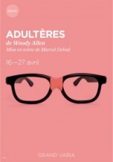 De Woody Allen. Mise en scène de Marcel Delval. Grand succès de la saison 2011-2012, revoici pour votre plaisir et pour le nôtre, ADULTÈRES, deux pièces en un acte de Woody Allen, véritable cocktail de cruautés qui explose les archétypes du couple bourgeois uni par l’argent, les affaires et la bienséance publique. Sexe, mensonges, aveux et trahisons de maris libidineux ou d’épouses insatisfaites sont au programme de cette comédie humaine à laquelle Woody Allen, le génie des névroses, donne une légèreté décapante. Marcel Delval, le metteur en scène, y ajoute, avec l’aide d’une belle bande d’acteurs et d’actrices aux rôles quelque peu fous furieux, le grain nécessaire : le théâtre qui nous fait rire. Rappelons que tout cela, qui se déroule dans des milieux dits "aisés", n’est bien entendu que pure fiction…