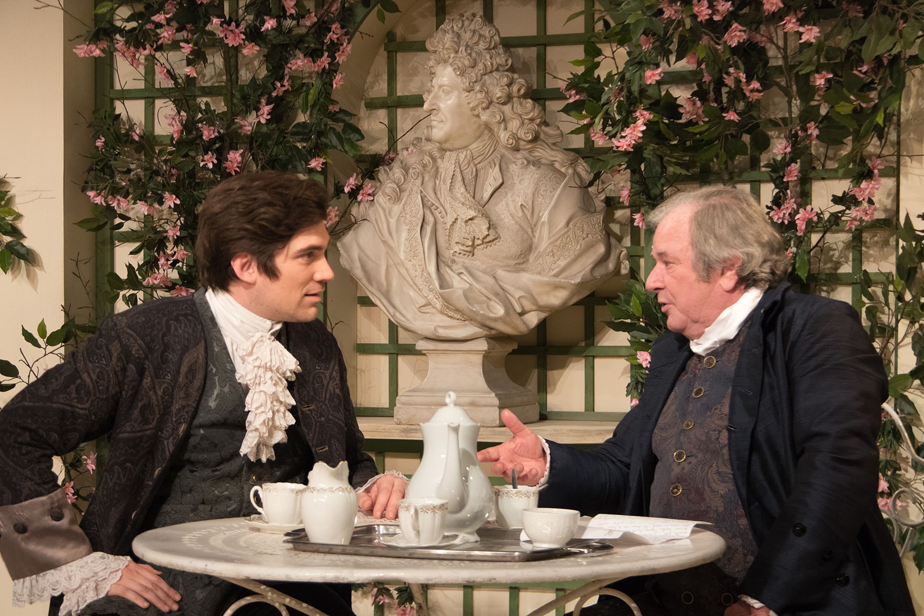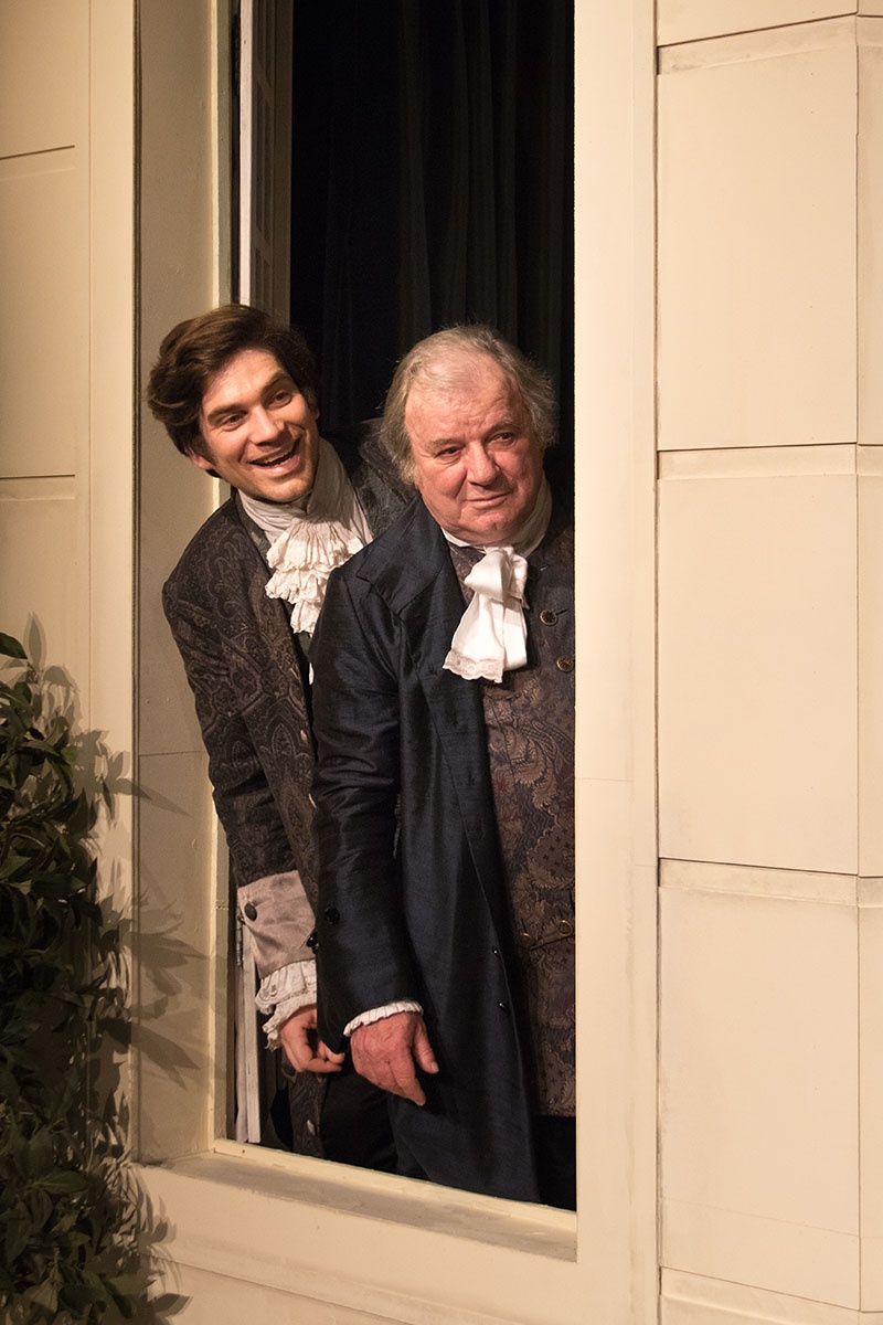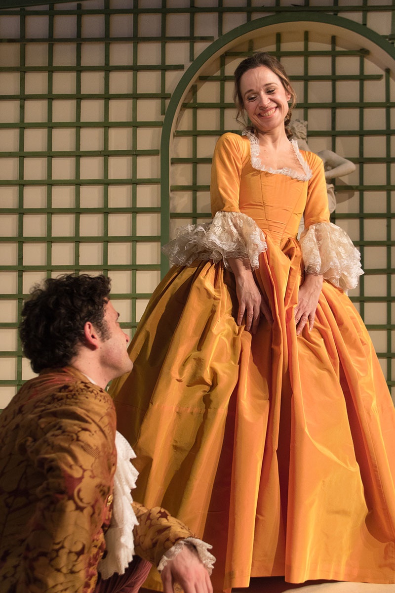 Double observation. Afin d’étudier le prétendant à loisirs, la jeune fille a décidé de prendre la place de Lisette, sa servante, et celle-ci, ravie de la récréation, jouera le rôle de la maîtresse. Mais, Dorante a eu la même idée : il s’est travesti en Bourguignon tandis que son valet, Arlequin, ravi lui aussi d’avoir l’occasion de malmener son maître, jouera sublimement au « Monsieur ». Le choix de Julien Besure ne pouvait pas faire mieux dans ce rôle de bouffon vaniteux, parfait malotru, sot et trivial, dont le jeu de jambes et de postures est éblouissant. Les habits et les manières, certes, peuvent contrefaire, mais la langue ne peut trahir. Du côté des nantis, c’est la qualité de la langue courtoise, vive et raffinée, qui révèle malgré les déguisements, la délicatesse et la sincérité des sentiments. Marivaux, l’esthète ! Serge Daems à la machine à coudre de costumes de rêve ! Et un rêve d’interprétation, tant pour la qualité de la diction que pour la qualité des intonations et la vérité de jeu, incarné par Caroline Lambert. On se souvient avec ravissement de l’espiègle servante espagnole de « Comme s’il en pleuvait », joué dans le même théâtre par la même exquise comédienne, qui a fait le cours Florent et ne déparerait pas à La Comédie Française ! Lumières et régie : l’impeccable Sébastien Couchard.