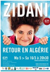 Le nouveau spectacle de ZIDANI ! Belge, d’origine Kabyle par son père, Sandra neconnaît pas l’Algérie. À 40 ans elle décide departir enfin à la rencontre de ses origines. Le jour du départ, la Belgique est paralysée par la neige, les vols sont annulés et le chaos s’installe dans l’aéroport. Chacun, avec son histoire,se retrouve figé dans son voyage. Sandra va découvrir qu’au delà du voyage se dessine une identité, un rêve oublié, une attente. Sans ces conditions météorologiques exceptionnelles,ces voyageurs insolites, bloqués dans le Noman’s land d’un aéroport, ne se seraient sans doute jamais rencontrés. Et si le voyage c’étaitla rencontre de l’être humain, tout simplement ? Du 5 au 16 mars 2013 à 20h. Relâche dimanche et lundi. Réservations : +32 (0)2 274 05 10 ou reservation@espacemagh.be Espace Magh - 17 rue du poinçon 1000 Bruxelles